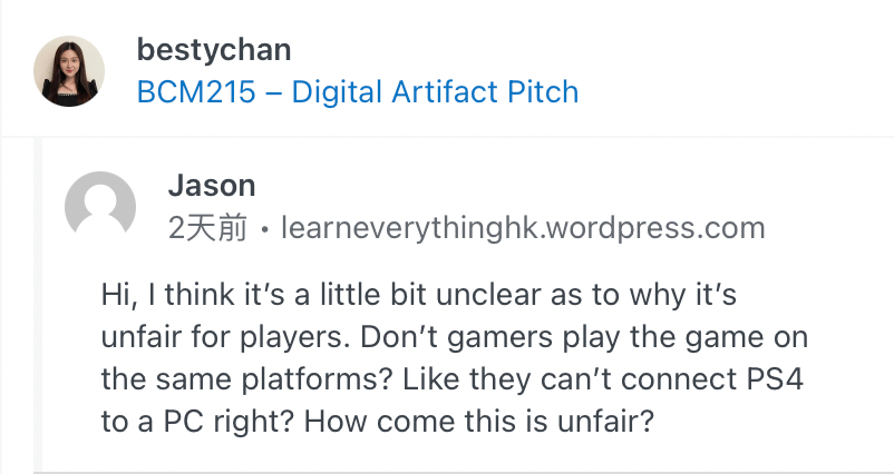 In my first video presentation, he asked me a few questions that helped me think about the imperfections of my research. My research topic is about different game experiences brought by different game platforms. I understand that the experience of a game on two different platforms is different. For example: PC vs mobile, or PS4 vs WILL. These platforms all use different controls, so the experience is relatively different. For gamers, even if two people are playing the same game, they have relatively unfair experience on different game platforms. I’ll look for more examples to explain this.