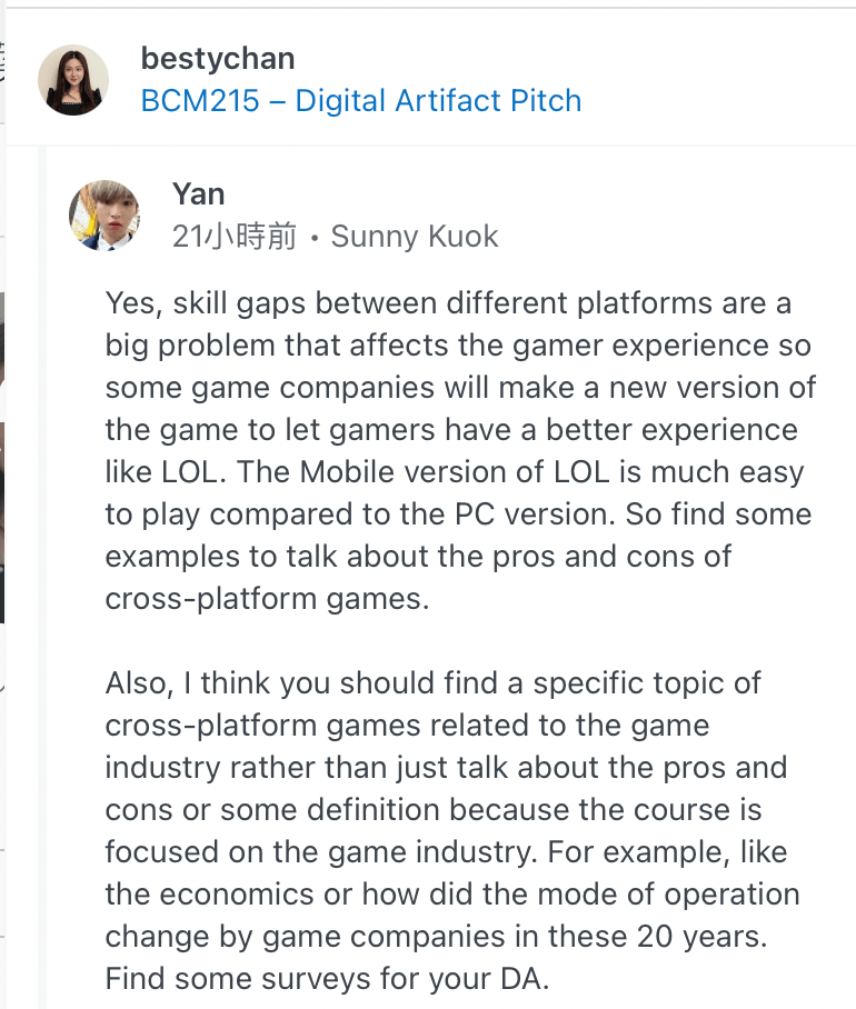 His opinions were very detailed, and he gave good examples for me to think about my DA. He mentioned that league of Legends has a different experience on the PC and mobile platforms, and that the mobile version is a better experience because it’s easier to play. I’ve played both versions of League of Legends myself, so I think so too. The first game that came to mind when I chose this theme was League of Legends. I may not have mentioned examples in my last blog post, but I will focus on improving the next blog post.
